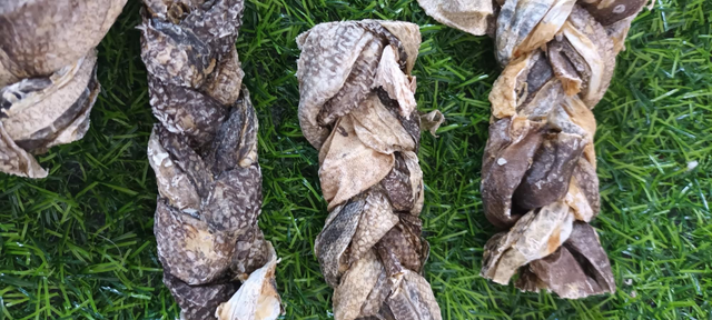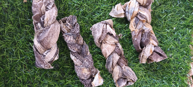 Air dried flaky fish skins in a braided design, perfect for a crunchy snack! Helps with maintaining a healthy skin and coat!